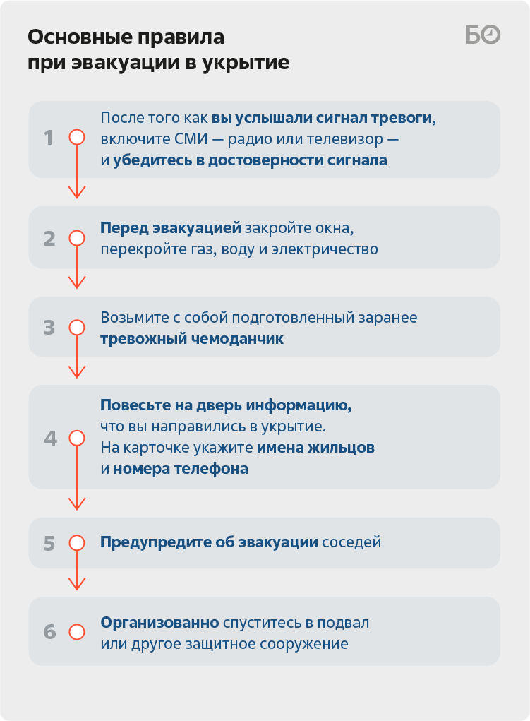- «Мы просим предупредить перед уходом соседей, потому что пожилые люди могут не услышать сигнал воздушной тревоги», — говорит Тимурханов. После этого организованно спускайтесь в подвал или другое защитное сооружение.