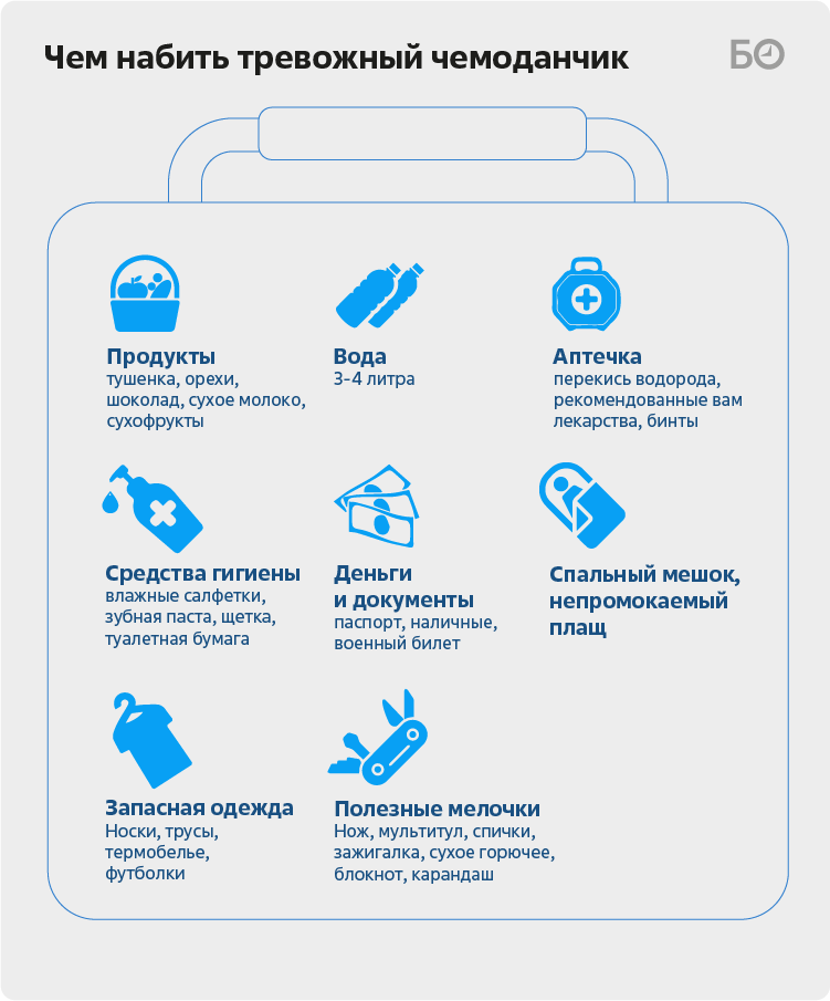 «В „тревожном чемоданчике“ необходимо иметь копии своих документов, чтобы они всегда там были. Запас воды нужен — примерно 3 или 5 литров. И сразу хочу обратить внимание, что из-под крана воду в бутылки не стоит заливать, потому что она быстро испортится. Желательно в магазине купить закрытую. Также необходимо иметь консервы запасом минимум на три дня», — уточнил Гисмятов.
