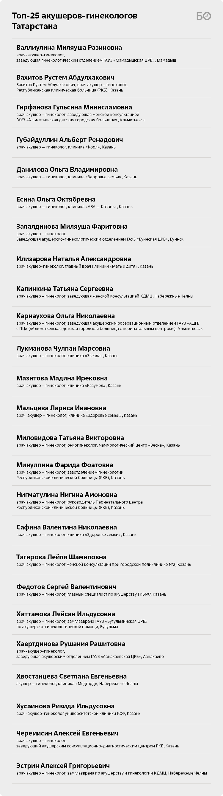 К сожалению, в одном тексте не перечислишь всех талантливых гинекологов Татарстана. Приглашаем читателей поделиться своим опытом и важными для них именами в комментариях. Быть может, кому-то ваш отзыв спасет жизнь.