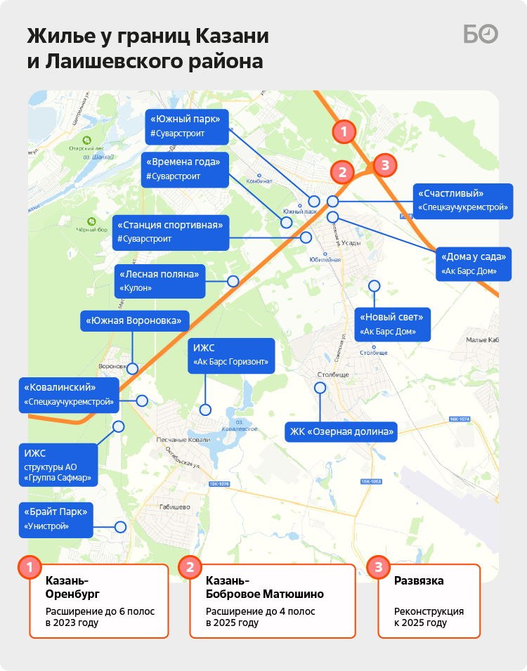 - Проект коттеджного поселка компаний, связанных с АО «Группа Сафмар» миллиардера Михаила Гуцериева, по дороге в Боровое Матюшино. На участке уже распланировали улицы, хотя по планам правительства РТ данный проект относится ко второму этапу — 2025–2029 годам.