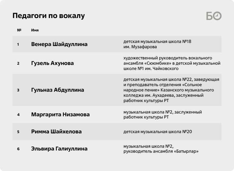 Наш топ начнем с вокала, поскольку голос — это тоже инструмент, с которым надо уметь работать. В этой части текста расскажем о педагогах по вокалу, которые взрастили и продолжают взращивать будущих известных певцов. Заслуженный работник культуры Татарстана Гульназ Абдуллина за десятки лет педагогического труда вырастила немало юных вокалистов, лауреатов российских и международных конкурсов. Среди них заслуженная артистка РТ Саида Мухаметзянова, которая называет Гульназ Талиповну любимым учителем. «Главная внучка республики» училась у Абдуллиной и в музыкальной школе №22, и в музыкальном колледже им. Аухадеева, где Гульназ Талиповна преподает и заведует отделением сольного народного пения. Кроме того, героиня нашего топа преподает вокал у 12-летней Милины Хайруллиной, которая сейчас, как когда-то Мухаметзянова, пробует силы в телешоу «Голос.Дети» на Первом канале. Причем Хайруллина попала в команду мировой оперной звезды своей землячки Гарифуллиной.