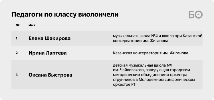 После нашумевшего сериала Тима Бёртона «Уэнсдей», в котором мрачная главная героиня Уэнсдей Аддамс играет на виолончели, отмечается некий рост интереса к этому «редкому и элитному инструменту», отмечают некоторые музыкальные эксперты «БИЗНЕС Online». Правда, на нем учат играть детей в Казани не так много педагогов. Среди них заслуженный работник культуры РТ Оксана Быстрова, которая заведует городским методическим объединением оркестра струнников. Она отвечает за класс виолончели в МСО РТ, а также готовит будущих музыкальных виртуозов в школе №1 им. Чайковского. Среди ее выпускников — финалист «музыкальной Олимпиады» (конкурса им. Чайковского) в 2023 году Василий Степанов, который пошел по стопам наставницы и стал преподавателем Московской консерватории. 31-летний музыкант обучался в мадридской Высшей школе музыки им. королевы Софии у известного виолончелиста Йенса Петера Майнца, выступал с именитыми мировыми дирижерами и много гастролировал за рубежом. Кстати, кумиром молодого исполнителя был великий Мстислав Ростропович, с которым Степанов познакомился лично в том числе благодаря Оксане Александровне. «Ростропович с [Галиной] Вишневской приехали в Казань, и мой педагог Оксана Александровна Быстрова повела наш класс в Казанскую консерваторию, чтобы на них посмотреть», — вспоминал Степанов в одном из интервью.