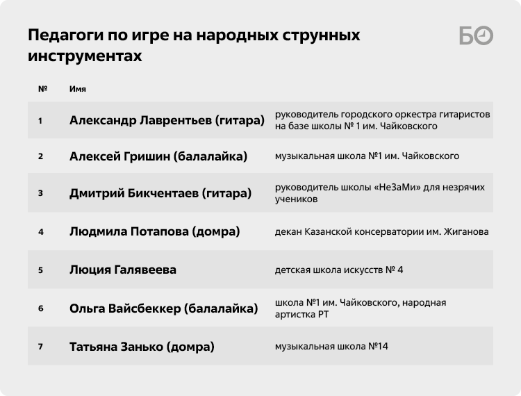 В Татарстане развитию исполнительского искусства на балалайке способствовал бывший проректор Казанской консерватории, музыкант, ставший авторитетным педагогом за пределами нашей республики, Шаукат Амиров (1947–2023). У него-то и училась народная артистка РТ Ольга Вайсбеккер — прима‑балалаечница, первая балалайка Госансамбля народных инструментов РТ, в котором она играет почти 30 лет. Вайсбеккер из семьи поволжских немцев, начала преподавать в музыкальной школе №1 им. Чайковского сразу после окончания Казанской консерватории и работает там до сих пор. Ее ученики становились лауреатами конкурсов Viva music и «Живой родник», а также республиканских музыкальных состязаний «Кудесница-балалайка». Отметили наши эксперты и коллегу Вайсбеккер по ГОНИ РТ Алексея Гришина, который тоже преподает игру на балалайке. Он постоянный участник постановок праздничных детских новогодних программ Госоркестра народных инструментов РТ в филармонии им. Тукая, которые стали яркими событиями в музыкальной жизни Казани и нравятся как юным слушателям, так и их родителям.