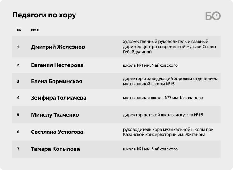 Не только юные музыканты, но и их педагоги могут похвастаться победами. В прошлом году руководитель хора музшколы при консерватории Светлана Устюгова стала обладательницей президентской премии для лучших педагогов в области музыкального искусства. Ее ученики тоже не промах: на протяжении нескольких лет они участвуют в различных концертных программах ГАСО РТ под руководством Сладковского. В июне этого года коллектив записывал вместе с оркестром 3-ю и 8-ю симфонии Густава Малера. Помимо преподавания, Устюгова успевает проводить мастер-классы, лекции и семинары не только в Казани, но и в близлежащих городах.