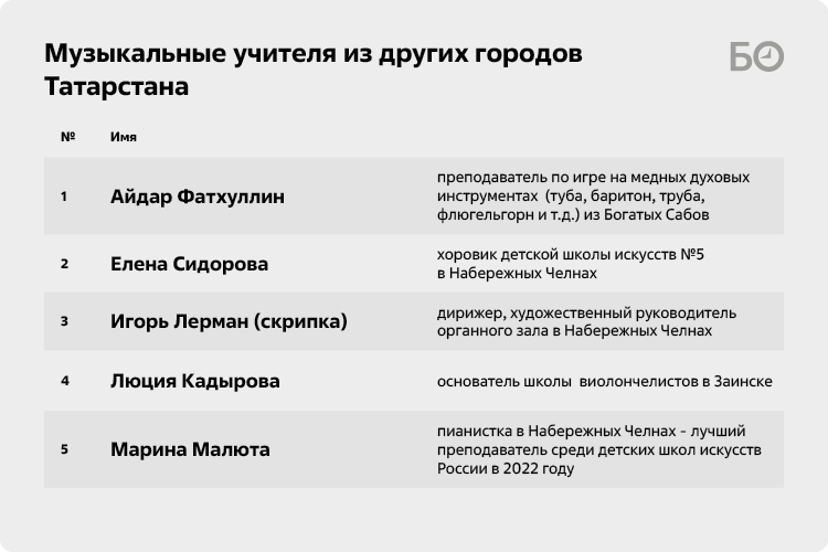 Вышеназванные педагоги не только передают детям знания и навыки игры на музыкальных инструментах, но и воспитывают в них творческое мышление, любовь к искусству и дисциплину. Благодаря их профессионализму и самоотдаче музыка в Татарстане звучит ярко и вдохновляюще, а каждый ученик получает возможность раскрыть свой потенциал и идти к мечте. Вклад этих педагогов невозможно переоценить — они формируют будущее культуры и искусства республики, вдохновляя новые поколения музыкантов.