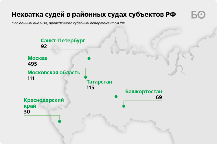 Проблема высокой нагрузки на судей отмечается не только в Татарстане. В мае этого года в Санкт-Петербурге заявили о нехватке судей из-за высокой нагрузки — некомплект районных судей в Северной столице составил 14,8%.