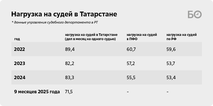 Один судья Вахитовского районного суда Казани в 2024 году рассматривал в среднем почти 114 дел в месяц. Больше сотни дел рассматривали судьи Ново-Савиновского, Приволжского, Советского судов Казани. В Набережночелнинском — 99 дел в месяц на судью, в Пестречинском — 86,3 дела в месяц