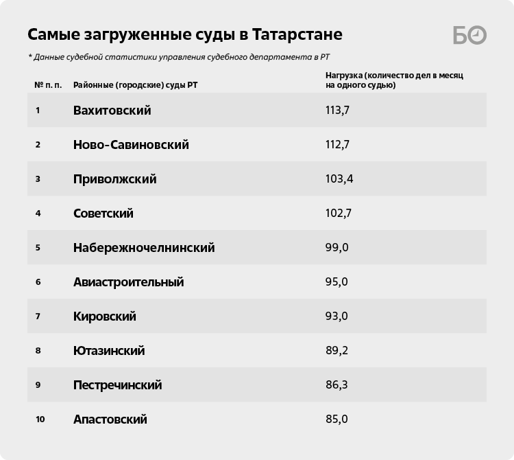 Пятерку самых загруженных судов республики замыкает Набережночелнинский — 99 дел в месяц на судью. И в списке самых загруженных не только казанские суды: например, в Пестречинском нагрузка на судью в прошлом году — 86,3 дела в месяц.