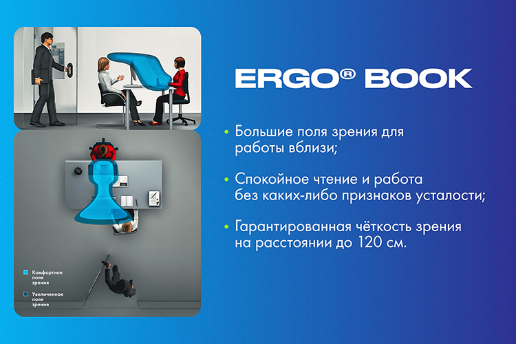 Ergo® Book подойдут для тех, кто работает с мелким текстом или занимается операциями, постоянно требующими «ювелирного» зрения вблизи. Широкие поля зрения избавят от ненужных поворотов головы, обеспечат четкое зрение в пределах «длины рук».
