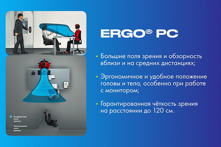 Ergo® PC адресованы тем, кто основное время проводит за компьютером. Эти линзы — спасение для бухгалтеров, редакторов, компьютерных дизайнеров, поскольку обеспечивают спокойное зрение без напряжения для типовых рабочих мест в офисах и дополнительно снимают нагрузку с грудного и шейного отдела позвоночника благодаря привычной удобной позе.