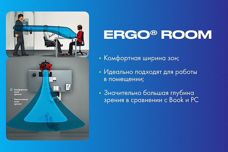 Ergo® Room идеальны для тех, кто активно двигается или вынужден часто менять направление взгляда. Если вы менеджер, врач, учитель или хозяйка, чей день проходит в движении между кухней, гостиной и домашним кабинетом, эти линзы обеспечат вам панорамное зрение во всем пространстве комнаты.