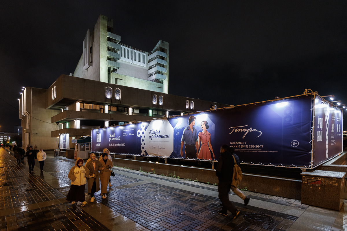Чтобы казанцы точно не пропустили исторический переезд, вдоль тротуара разместили большой баннер с приглашением на премьеру. Кажется, реклама сработала, поскольку в большом зале (он вдвое больше того, которым театр располагал в здании на ул. Горького, 13) в продаже не осталось билетов.