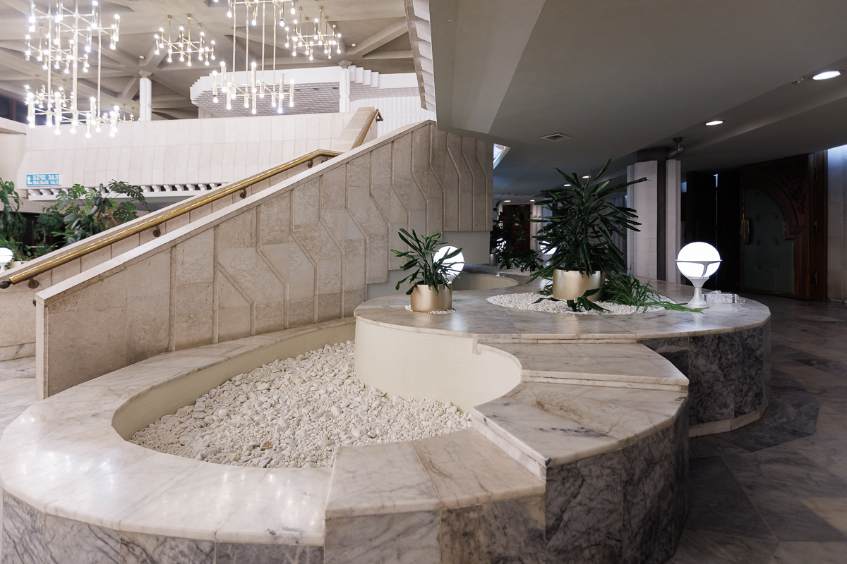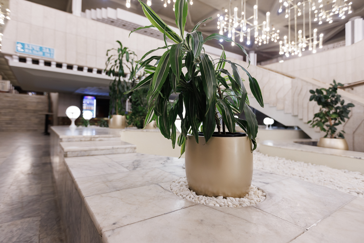 «Зеленый уголок» в фойе решили оставить — оживили поникшие растения и посадили их в золотые кашпо.