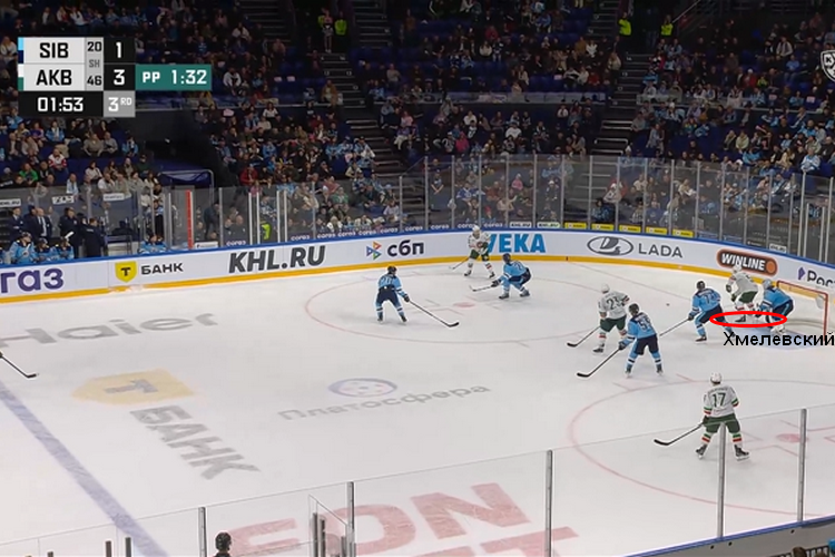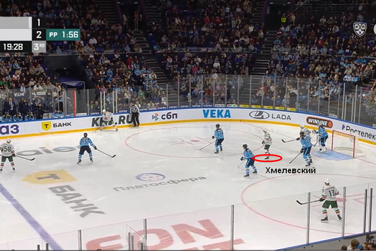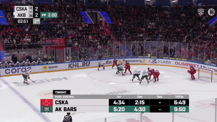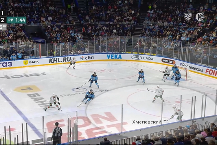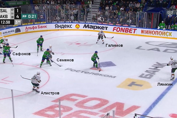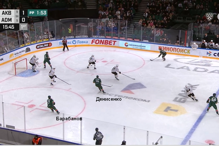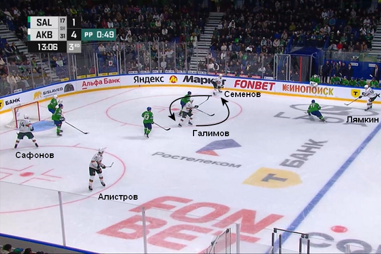 Еще одно изменение «Ак Барса» в большинстве — вариативность. Тренерский штаб определился со спецбригадами, но не стал четко закреплять за игроками отдельные позиции. Да, защитник всегда действует на синей линии, однако нападающие активнее меняются местами. Например, на скриншотах ниже видно, как меняются местами Галимов и Семенов. Сначала Артем играл в центре.