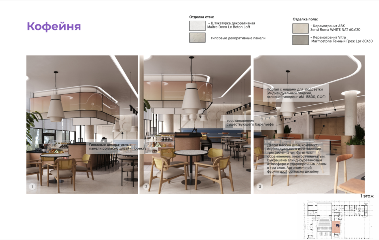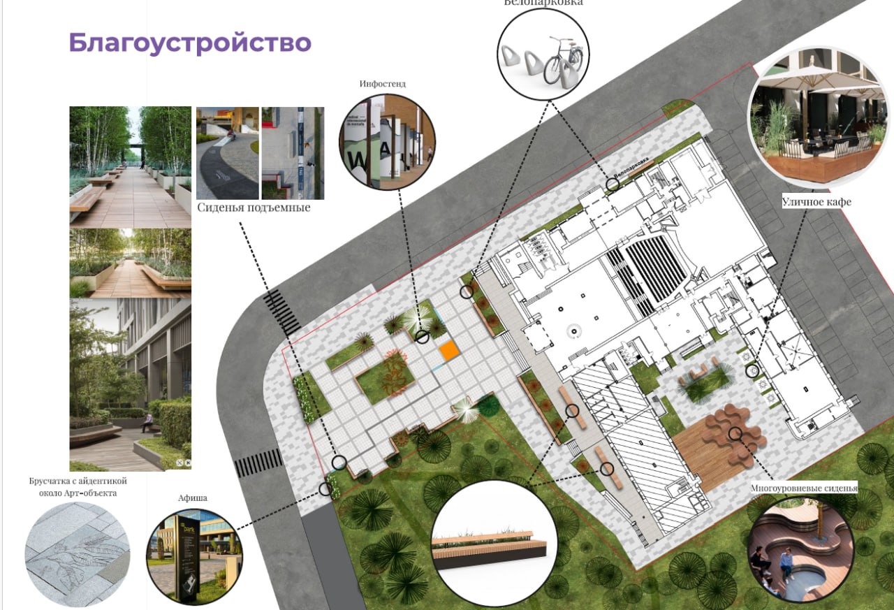 Помимо этого, в перечень работ вошло и благоустройство территории вокруг здания. Здесь установят различные скамейки и сиденья. Во дворе появится уличное кафе и велопарковка.