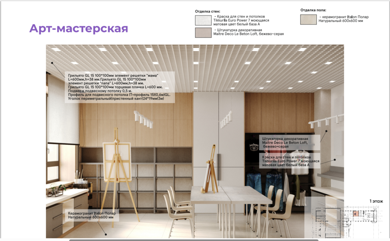 На базе Дворца культуры будут действовать арт-резиденция, художественная и гончарная мастерские. Появится оборудование для создания небольших предметов декора, работы с пластиком и тканью. Также появятся гримерки, переговорные помещения, кухня, гончарная и рабочие кабинеты.