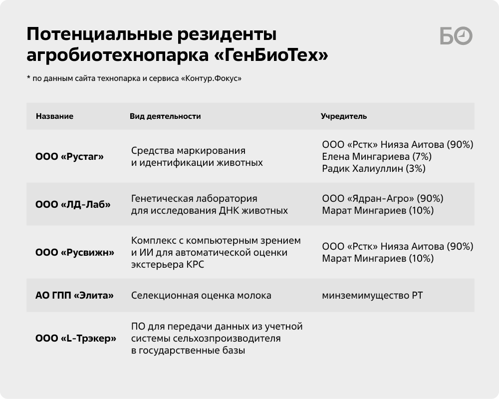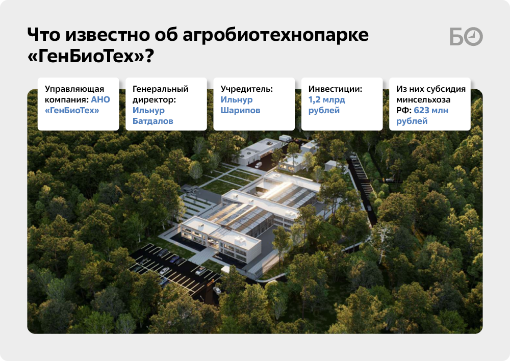 Судя по данным сервиса «Контур.Фокус», АНО «ГенБиоТех» зарегистрировано в апреле 2025 года в Казани на улице Камалеева, 32. Основным видом деятельности значатся «научные исследования и разработки в области биотехнологии». Учредителем организации выступает Ильнур Шарипов (экс-зампредседателя госкомитета РТ по архиву), гендиректором — Ильнур Батдалов. Как говорят спикеры издания, Батдалов ранее уже руководил IT-проектом в сельском хозяйстве, причем вполне успешно — под его началом была разработана система учета сельхозживотных, которая способна заместить аналогичные иностранные программы.