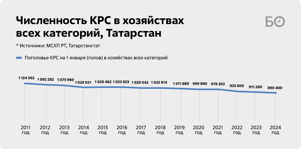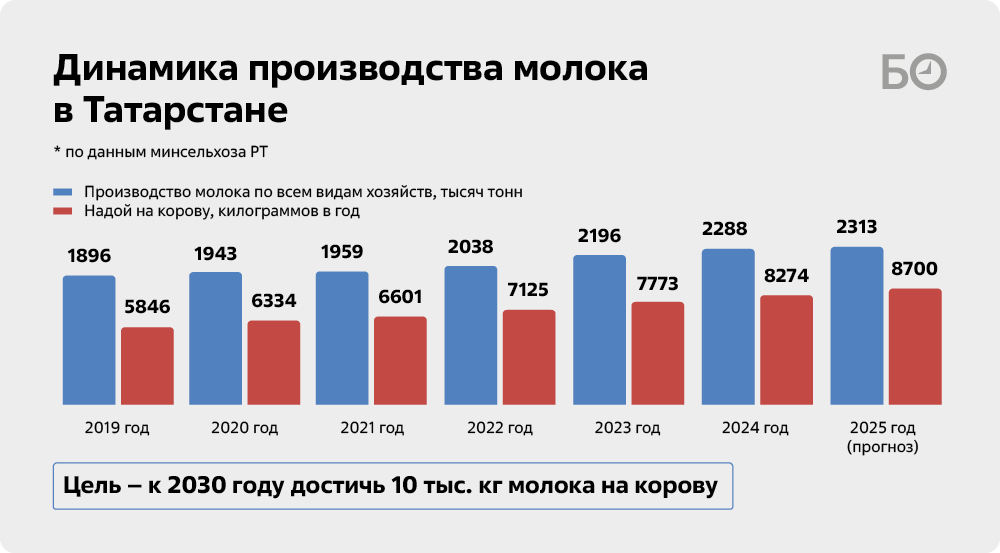 Молоко — это белая нефть Татарстана. Вот уже 15 лет РТ удерживает «молочную корону» страны по объемам надоев сырого молока. И показатели постоянно растут. Если в 2020-м по всем видам хозяйств в республике было надоено 1,935 млн т, то по итогам 2025-го ждут не менее 2,3 млн тонн. В условиях того, что число коров в регионе (как и во всей России) за последние много-много лет неуклонно падает, вывод напрашивается только один — молочный рывок обеспечивается за счет роста продуктивности коров. Если в 2020-м средняя буренка давала 6,3 тыс. кг молока в год, то в 2024-м эта цифра составила уже 8,3 тыс. кг, а на 2025-й прогнозируется 8,7 тыс. кг на голову. А недавно раис РТ Рустам Минниханов поставил новую цель — надаивать к 2030 году не менее 10 тыс. кг на голову. В региональном минсельхозе считают ее вполне достижимой.