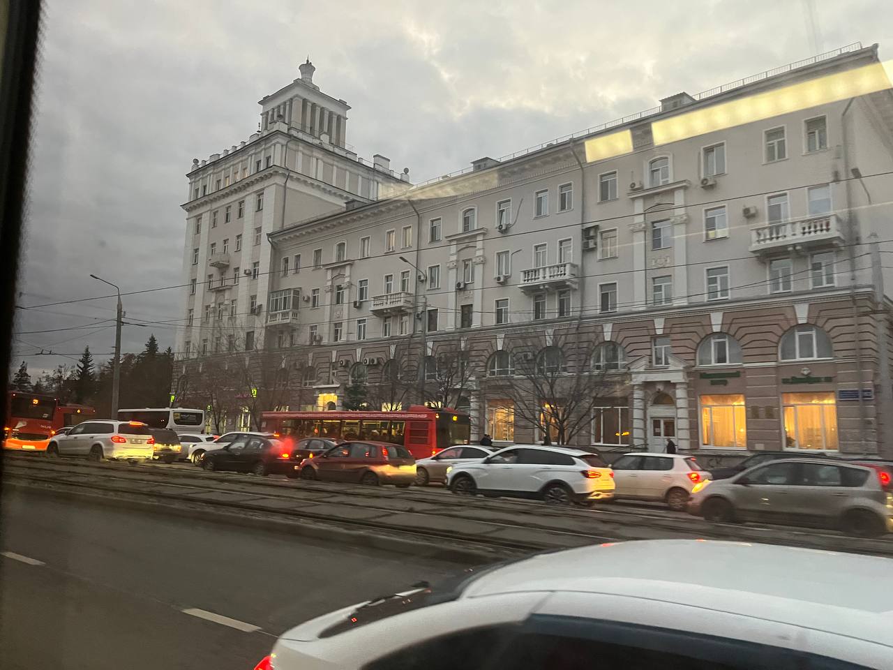 Пробка скапливается по причине того, что трамвай перекрыл дорогу в сторону центра. О причинах аварии неизвестно, также пока нет информации о пострадавших.