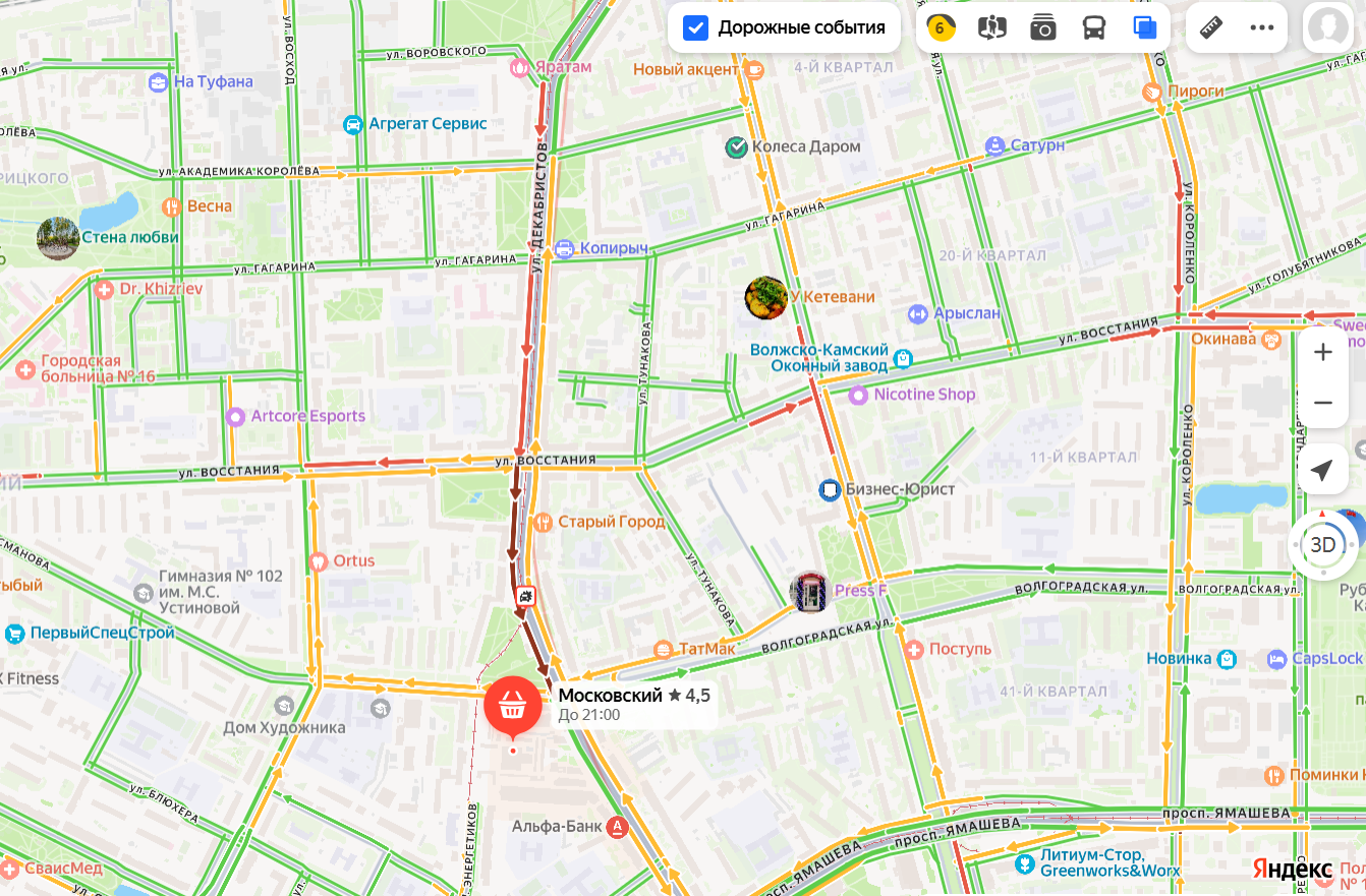 В Казани у Московского рынка столкнулись трамвай и автобус, из-за чего временно не ходят трамваи. По этой причине на улице Декабристов собирается пробка в 1 км, а также стоят два трамвая № 1 и один № 6, следует из сервиса «Яндекс.Карты». Как сообщает корреспондент «БИЗНЕС Online», на место аварии приехали две скорые.