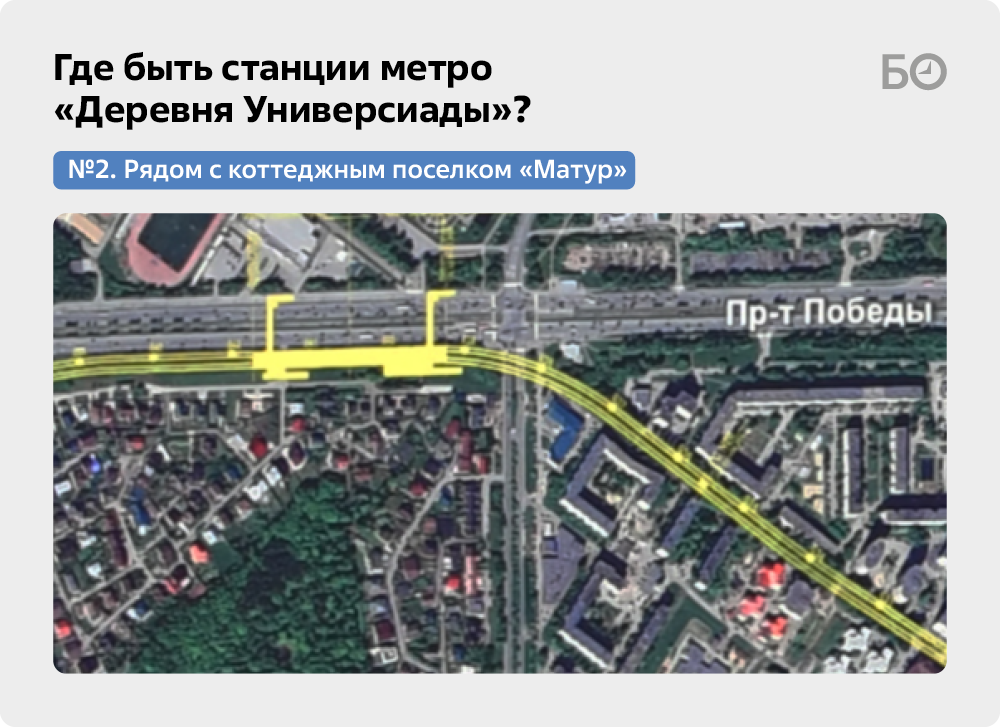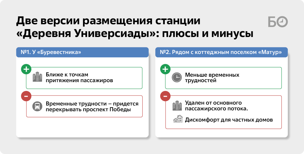 Лучше ситуация для строительства в случае расположения станции на стороне коттеджного поселка — этот вариант не так затрагивает проспект Победы. «Да, дорогу не перекрываем, избегаем временных трудностей, но в итоге получаем неудобства для пассажиров, когда станция будет работать», — говорит эксперт.