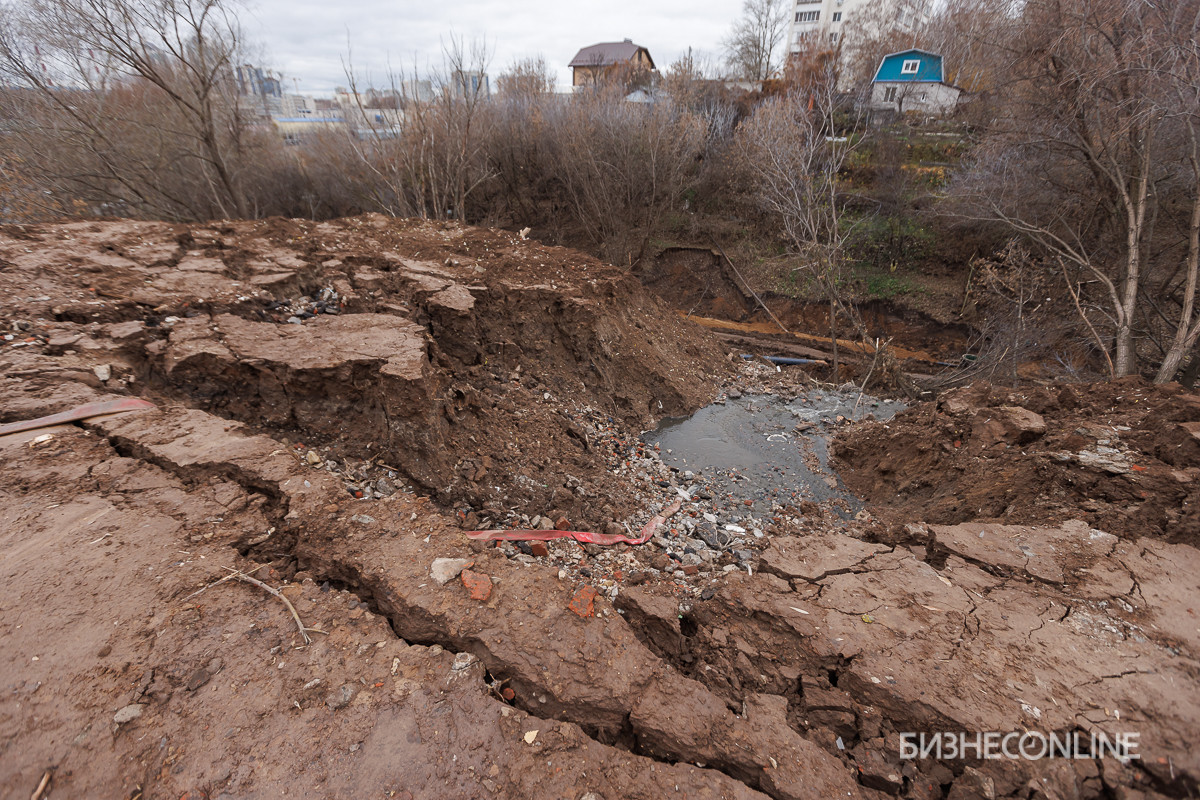 Территорию рядом с многоквартирным домом на ул. Латышских Стрелков, 25а засыпали грунтом, строительными отходами объемом 4,5 тыс. куб. м — это 150 самосвалов объемом 30 кубов, оценили в водоканале. Отсутствие подпорной стенки привело к сползанию земли в овраг — а там коммуникации… Оползень разрушил два колодца самотечного канализационного коллектора, принимающих стоки со всего микрорайона «Танкодром». Нечистоты поплыли наружу через насыпь и стали течь в сторону проспекта Универсиады. Канализация и сегодня вытекает из-под смеси земли и битого кирпича.