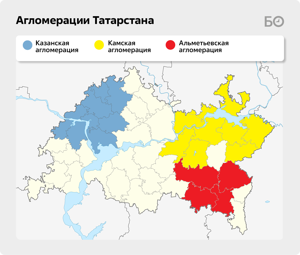 В республике создано три агломерации: Казанская, Камская и Альметьевская. Каждая из них носит характер межмуниципального образования. Например, в Казанскую агломерацию, помимо самой Казани, включены также и близлежащие районы (Атнинский, Верхнеуслонский, Высокогорский, Зеленодольский, Лаишевский и Пестречинский), даже учитываются города соседнего региона (Волжск, Звенигово). Агломерации — это путь развития за рамками муниципальных границ, на основе экономических, транспортно-логистических связей, совместных инвестиционных проектов и т. д., чтобы подтягивать слабых к сильным, не меняя их границ, а путем межмуниципальных экономических соглашений друг с другом. По этой же самой логике «Татнефть», например, создает свою ОЭЗ на территории сразу четырех районов республики, руководствуясь не территориальными границами, а скорее экономической целесообразностью.