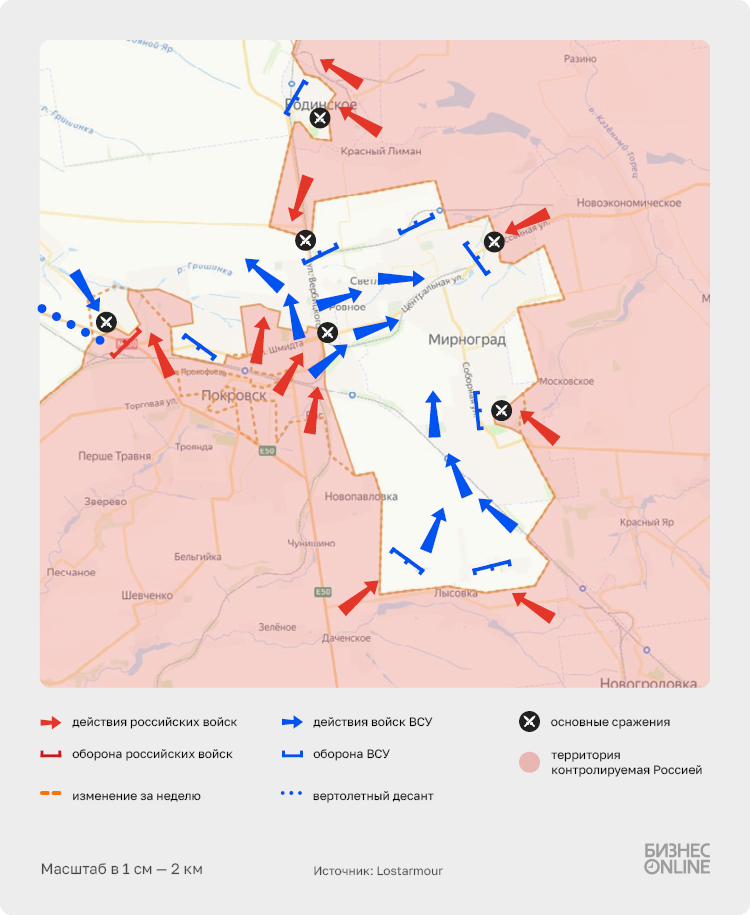 Затем автор делает весьма странный вывод, согласно которому в рамках сражения за Покровскую агломерацию ВС РФ пробовали провести лобовой штурм. Возможно, он имеет в виду встречные бои зимы 2024–2025 годов, когда российские части закрепились на окраинах города. Но в целом данный маневр в сражении за Красноармейск отсутствовал, группа войск «Центр» методично обходила агломерацию по флангам, в результате чего в августе ситуация начала принимать текущий характер боевых действий.