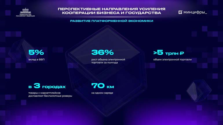- Платформенная экономика обеспечивает около 5% ВВП России, а объемы электронной торговли за первое полугодие увеличились более чем на треть, превысив 5 трлн рублей.