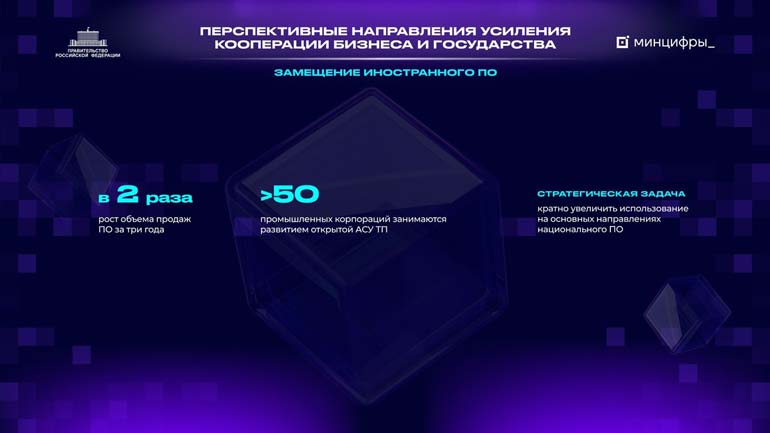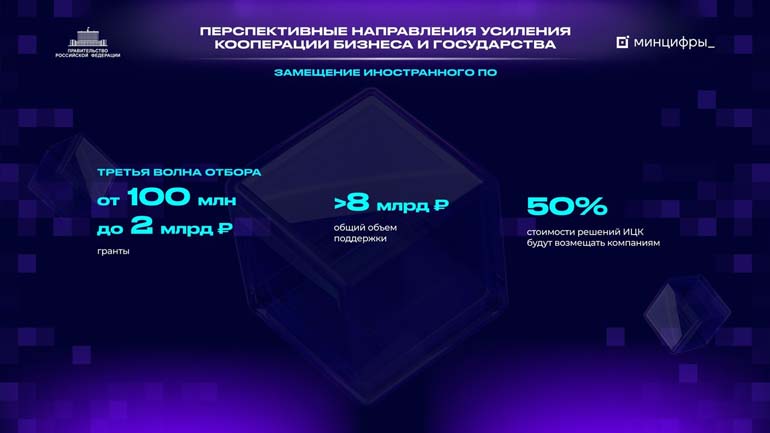 Держать курс на замещение иностранного программного обеспечения будут и в следующем году. За последние три года объем продаж российского базового ПО вырос в 2 раза, разрабатываются специализированные версии для конкретных отраслей. В следующем году государство продолжит возмещать крупным промышленным компаниям до половины стоимости отечественных решений, которые появляются на базе индустриальных центров компетенций.