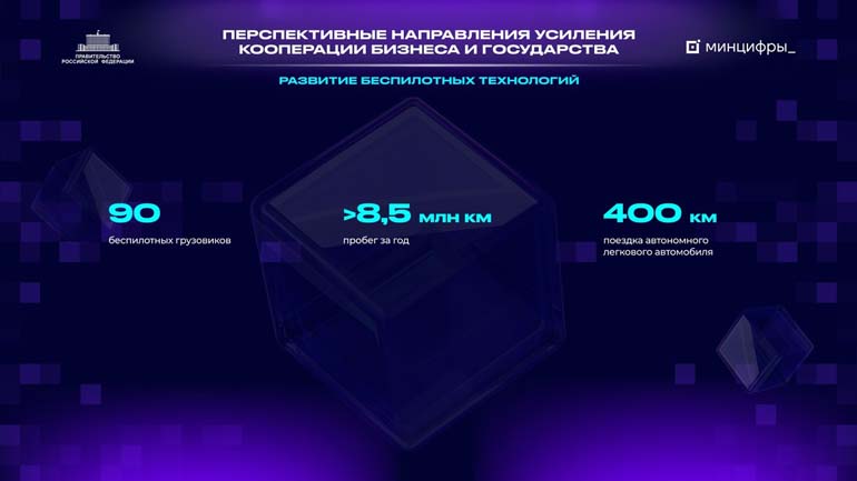 Еще одна важная деталь — качественная связь, необходимая в том числе для беспилотных систем. Уже сейчас на трассах передвигаются 90 беспилотных грузовиков, их пробег превысил 8,5 млн километров. В октябре беспилотный автомобиль самостоятельно проехал в 400 км из Тулы в Москву и обратно. «Водитель-испытатель был в машине, но ни разу, и это зафиксировано, не вмешивался в работу системы, в управление», — похвастался Мишустин. Первые беспилотные такси уже планируется запустить по улицам столицы в следующем году.