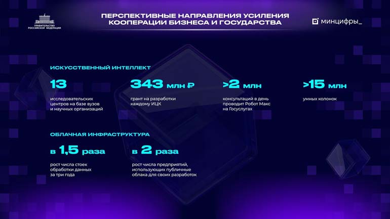 Одно из важных в последние годы направлений — решения в области искусственного интеллекта, которые потребуют новой облачной инфраструктуры. «За последние три года количество стоек в коммерческих центрах обработки данных выросло более чем в 1,5 раза. А число предприятий, использующих публичные облака для создания своих приложений, уже удвоилось», — отметил премьер-министр. Он поручил минцифры определить требования к облачной инфраструктуре, необходимой для размещения на ней корпоративных систем «для решения задач государственного управления и социальной сферы».