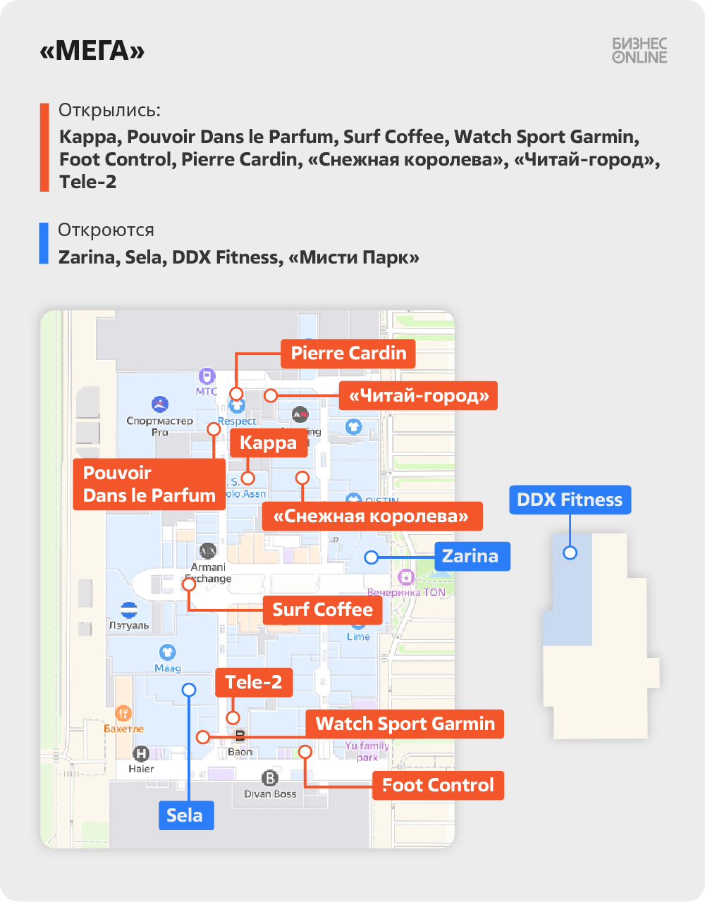 Комплекс покинул единственный в городе магазин Mango. На его место уже в декабре переедет Zarina — бренд, который и сейчас представлен в «МЕГЕ» в небольшом устаревшем формате, но новый магазин будет значительно просторнее и современнее, с мужской линией одежды. То же самое произойдет с Sela — бренд уже есть в «МЕГЕ», но скоро переедет на место lady & gentleman Street. Основной магазин lady & gentleman, расположенный в премиальной зоне ТЦ, останется на месте. После переезда площадь Sela увеличится с 358 до 1 165 кв. метров.