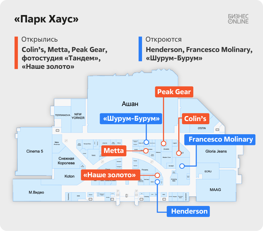 К декабрьскому открытию готовится магазин мужской одежды Henderson. Вместо корейской косметики и игрушек YOKO откроется шоурум сумок и чемоданов Francesco Molinary. Напротив «Ашана» — «Шурум-Бурум», а на втором этаже запустят новый бренд одежды для детей и подростков.