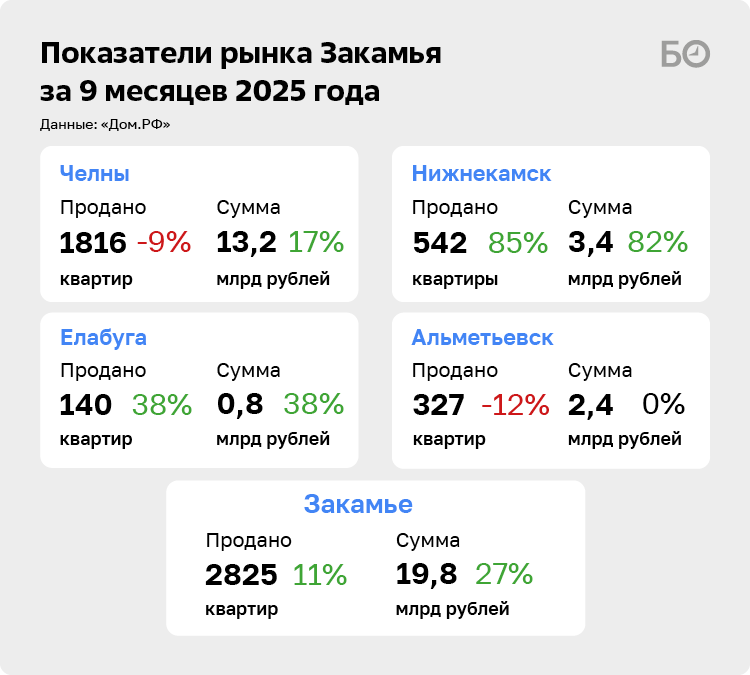 Но зато почти двукратный рост отмечен в Елабуге — до 140 проданных квартир. Бросается в глаза Нижнекамск. За 9 месяцев 2025-го продали 542 квартиры на 3,4 млрд рублей. Для понимания: в прошлом году реализовали всего 81 квартиру на 600 млн рублей. «Уверен, что это связано с низкой базой прошлого года, — объясняет Александров. — В целом же в Нижнекамске довольно понятные и стабильные продажи. Все идет в нормальном режиме».