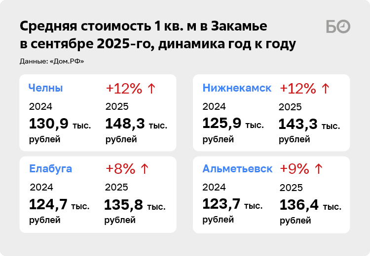 Стоимость квадратного метра в Закамье, напомним, в 2024 году побила все рекорды и выросла на 39% до 129 тыс. рублей. Но в 2025-м темп роста резко упал. За год цена «квадрата» выросла на 11% — в целом так же изменился «квадрат» и в Казани. В начале осени жилье в Закамье продавали за 145 тыс. рублей за 1 кв. метр.
