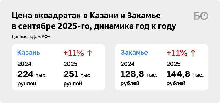 За год цена «квадрата» выросла на 11% — в целом так же изменился «квадрат» и в Казани. В начале осени жилье в Закамье продавали за 145 тыс. рублей за 1 кв. метр