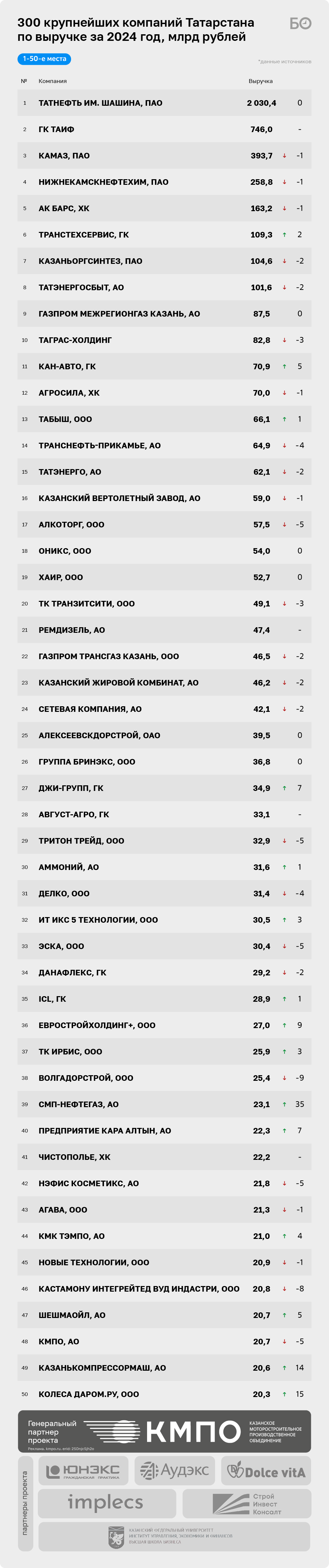 Редакция благодарит генерального партнера проекта «Топ-300» АО «Казанское моторостроительное производственное объединение», а также партнеров: аудиторско-консалтинговую компанию ООО «АКК «Аудэкс», юридическое агентство «Юнэкс», официального партнера 1С «Имплекс», специализированного застройщика «Дольче Вита», девелоперскую компанию «Строй Инвест Консалт», высшую школу бизнеса МВА КФУ.