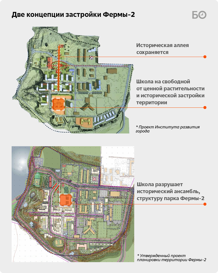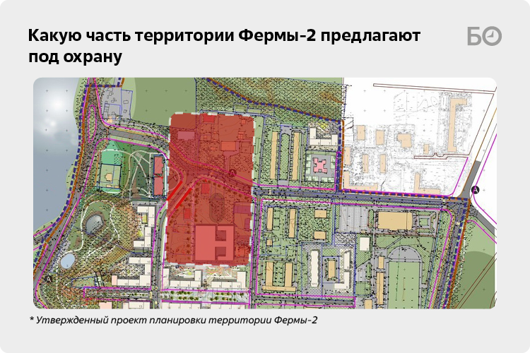 «ВООПИиК выезжало и обследовало территорию, привлекало дендролога, дополнительные исследования провел Институт развития города. И подали заявку на комплексное внесение территории как достопримечательного места. Этот режим предполагает ограниченное строительство и прописывает предметом охраны историческую планировку и зеленые насаждения — это как раз важно в контексте данной территории, — объяснила „БИЗНЕС Online“ помощник раиса РТ Олеся Балтусова. — Совещание по этому поводу также проводил Рустам Нигматуллин (вице-премьер РТ — прим. ред.), где обсудили две концепции застройки территории Фермы-2».