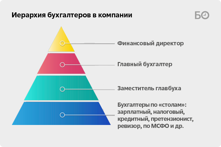 Начнем с первой категории. Бухгалтерский отдел в компании подчинен строгой иерархии, где у каждого специалиста своя зона ответственности. На вершине «пирамиды» — финансовый директор, главный бухгалтер (главбух) и его заместитель.