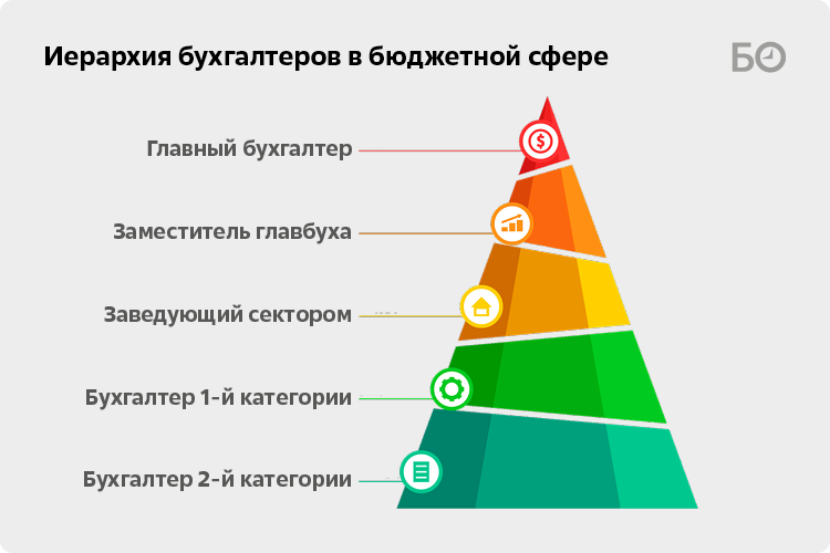 Примерно та же иерархичная структура соблюдается и в бюджетных организациях. Например, департамент образования Казани имеет свою бухгалтерию. Руководит ей главный бухгалтер, также имеется его заместитель. Управление разбито на группы и секторы: сектор по расчету заработной платы сектор, сектор по учету материальных ценностей и др. У каждого сектора имеется свой заведующий, а основными рабочими лошадками всех секторов и групп являются бухгалтеры 1 и 2 категории. В ревизионной группе есть бухгалтер-ревизор.