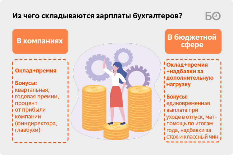 Бухгалтеры в бюджетной сфере: зарплата + премия + соцвыплаты и матпомощь. Так, зарплата бухгалтера в структурных подразделениях исполнительного комитета Казани состоит из должностного оклада, а также стимулирующих и компенсационных выплат. Системой оплаты труда предусмотрены единовременные выплаты социального характера: при уходе в очередной отпуск (1,2 должностного оклада) и матпомощь по итогам года (1 должностной оклад). Зарплата бухгалтера также растет с увеличением стажа работы и при повышении по служебной лестнице (надбавка за классный чин зависит от занимаемой должности и стажа работы).