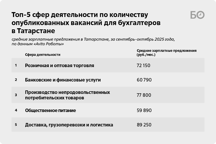 При этом бухгалтеры входят в число наиболее востребованных офисных специалистов как по России, так и в отдельных регионах, отмечает региональный представителя «Авито Работы» в Татарстане Михаила Копылова. По количеству вакансий для массовых офисных сотрудников, опубликованных в Татарстане, бухгалтеры находятся на третьем месте после менеджеров по продажам и инженеров. Чаще всего вакансии для бухгалтеров публикуют работодатели из сферы розничной и оптовой торговли. В топ-5 отраслей по числу предложений для этих специалистов также входят: банковские и финансовые услуги; производство непродовольственных потребительских товаров; общественное питание; сфера доставки, грузоперевозок и логистики.