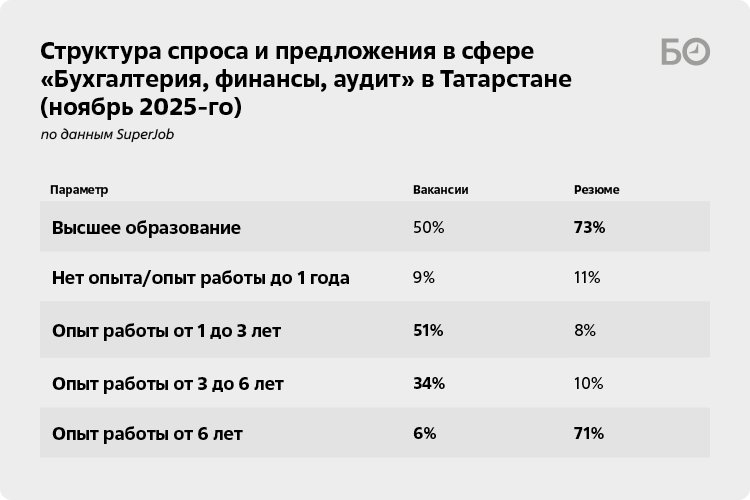 По данным Superjob, за 2025 год вакансий в сфере «Бухгалтерия, финансы, аудит» за год в Татарстане стало на 15% меньше, а число резюме выросло на 9%