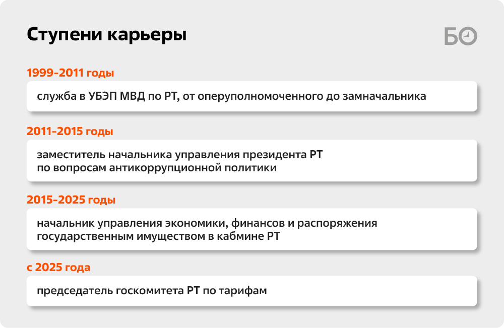 Гайнутдинов состоял в кадровом резерве президента РТ, и, как говорят источники, в 2015 году антикоррупционера заприметили и повысили до начальника управления экономики, финансов и распоряжения государственным имуществом в кабмине РТ. Структуру курирует вице-премьер РТ Рустам Нигматуллин, который, кстати, также отвечает за тарифный комитет. Управление взаимодействует с рядом профильных министерств: минземимуществом, минэкономики, минфином. Документы от этих ведомств сотрудники управления обрабатывают и доводят до кабмина.