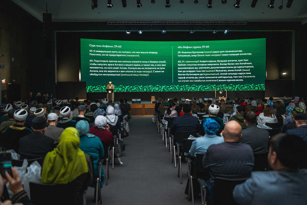 Отчетное собрание ДУМ РТ началось с рецитации священной Книги мусульман. Хафиз-Курра, то есть владеющий 10 видами чтения Корана, прямой потомок Пророка Мухаммада, член Комиссии ДУМ РТ по рукописному Корану Маъмун Ар-Рави декламировал аяты из суры «Анфаль» («Трофеи»). Они были выбраны не случайно: там сообщается о сражениях с неверующими и победе, которую Всевышний обещает верующим.