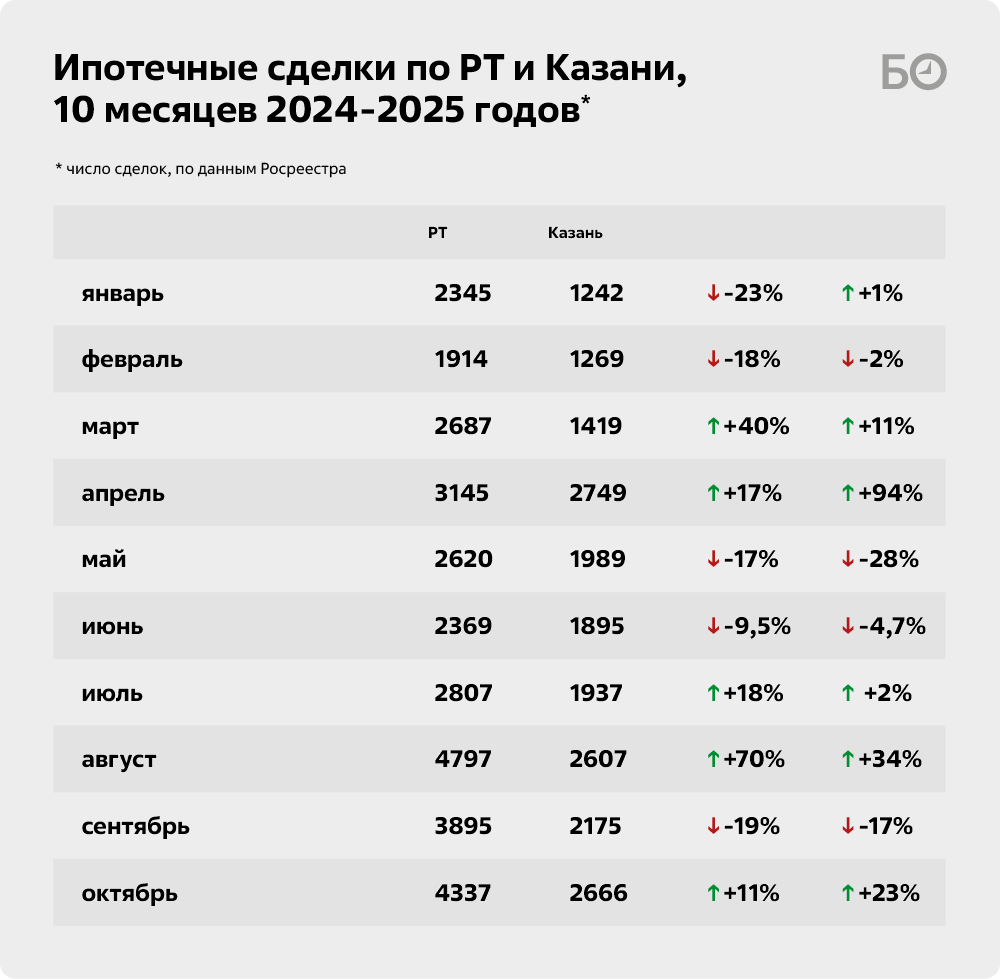Количество сделок с ипотекой в целом по РТ за месяц выросло сразу на 15% до 7 тыс., а к уровню октября 2024 года — на 9,5%, говорится в статистике Росреестра по РТ. Для сравнения: в сентябре количество ипотечных сделок по региону сократилось на 18% к уровню августа.