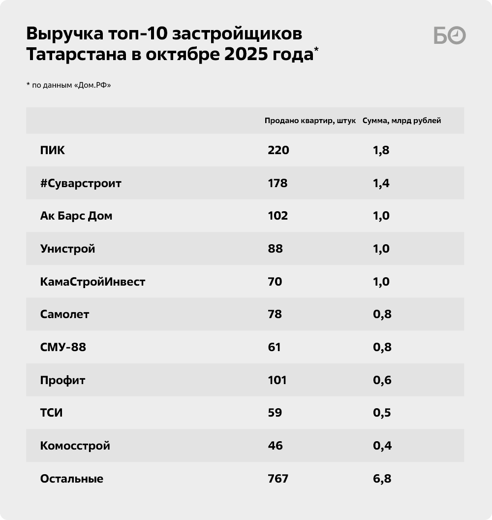 Замыкает тройку «Ак Барс Дом» — 102 квартиры за 1 млрд рублей. На 4-м месте «Унистрой» — компания реализовала 88 объектов за 1 млрд рублей. На эту же сумму, но 70 квартир продал «КамаСтройИнвест» — это 5-я позиция.