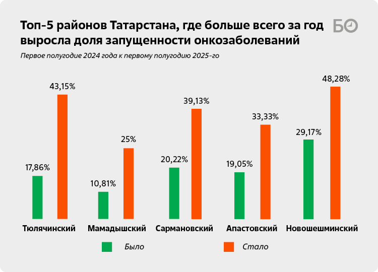 В районах тоже ситуация непростая. Согласно отчету минздрава республики, опубликованному на портале «Открытый Татарстан», за год (сравнивались январь – июнь 2024-го и 2025-го) рост количества запущенных раков произошел в 28 районах РТ из 43! В 2024 году таких районов было 18, по итогам первого полугодия 2023-го — 12. В среднем по республике рост показателя незначительный: с 23,6 до 23,81%, но в некоторых районах скачок произошел серьезный: допустим, в Тюлячинском — с 17,86 до 43,15%.