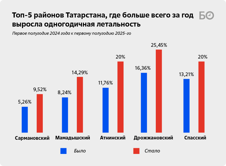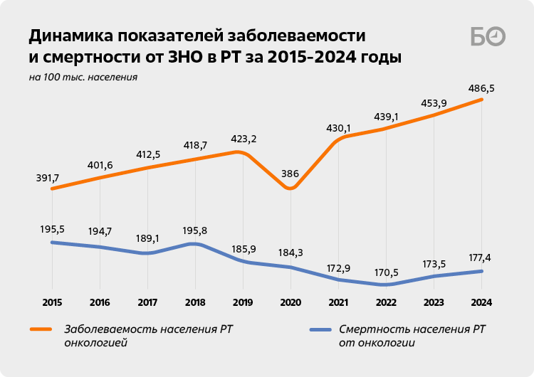 В том же отчете говорится, что в 26 районах выросла и одногодичная летальность (в 2024-м таких было 17). Хотя в целом по республике этот показатель даже снизился — количество людей, умерших в течение первого года с момента постановки диагноза злокачественного новообразования, сократилось с 18,27 до 17,01%.